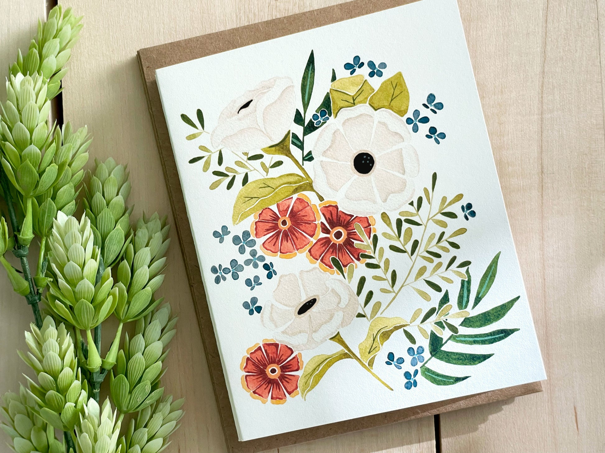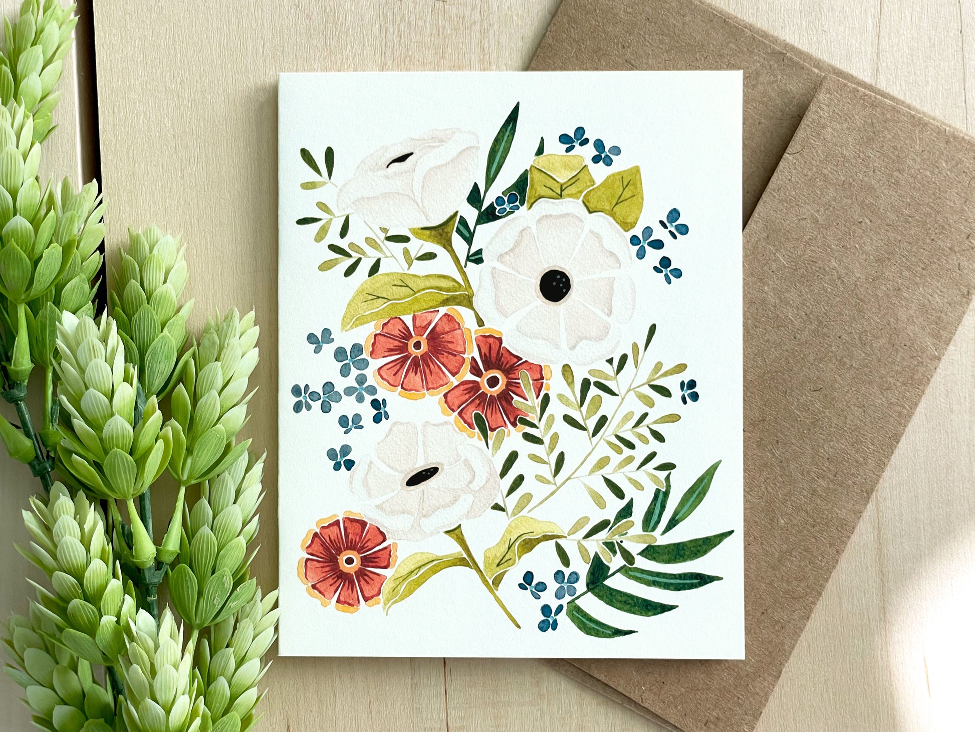 Set of five 4x5 folded cards and five kraft self-sealing envelopes.