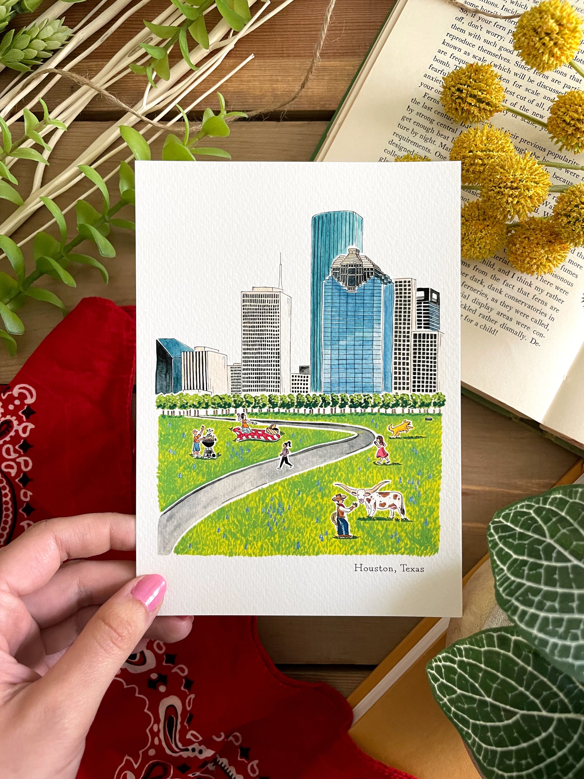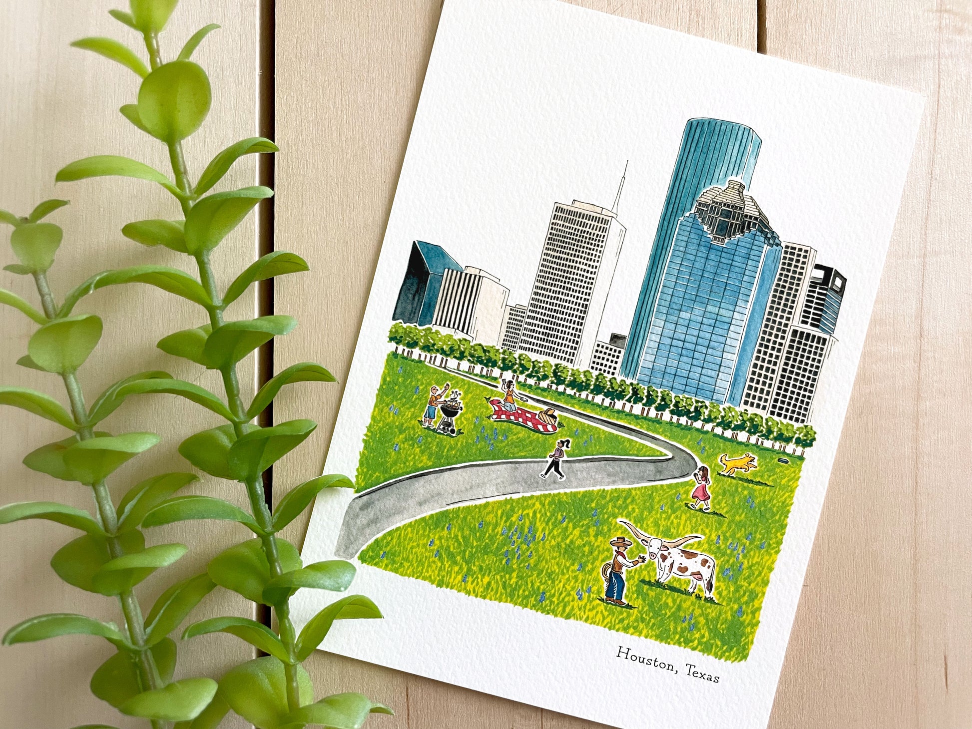 Travel to Houston, Texas with this watercolor art print! Enjoy the rodeo and bluebonnets of Houston in this sunny painted scene.