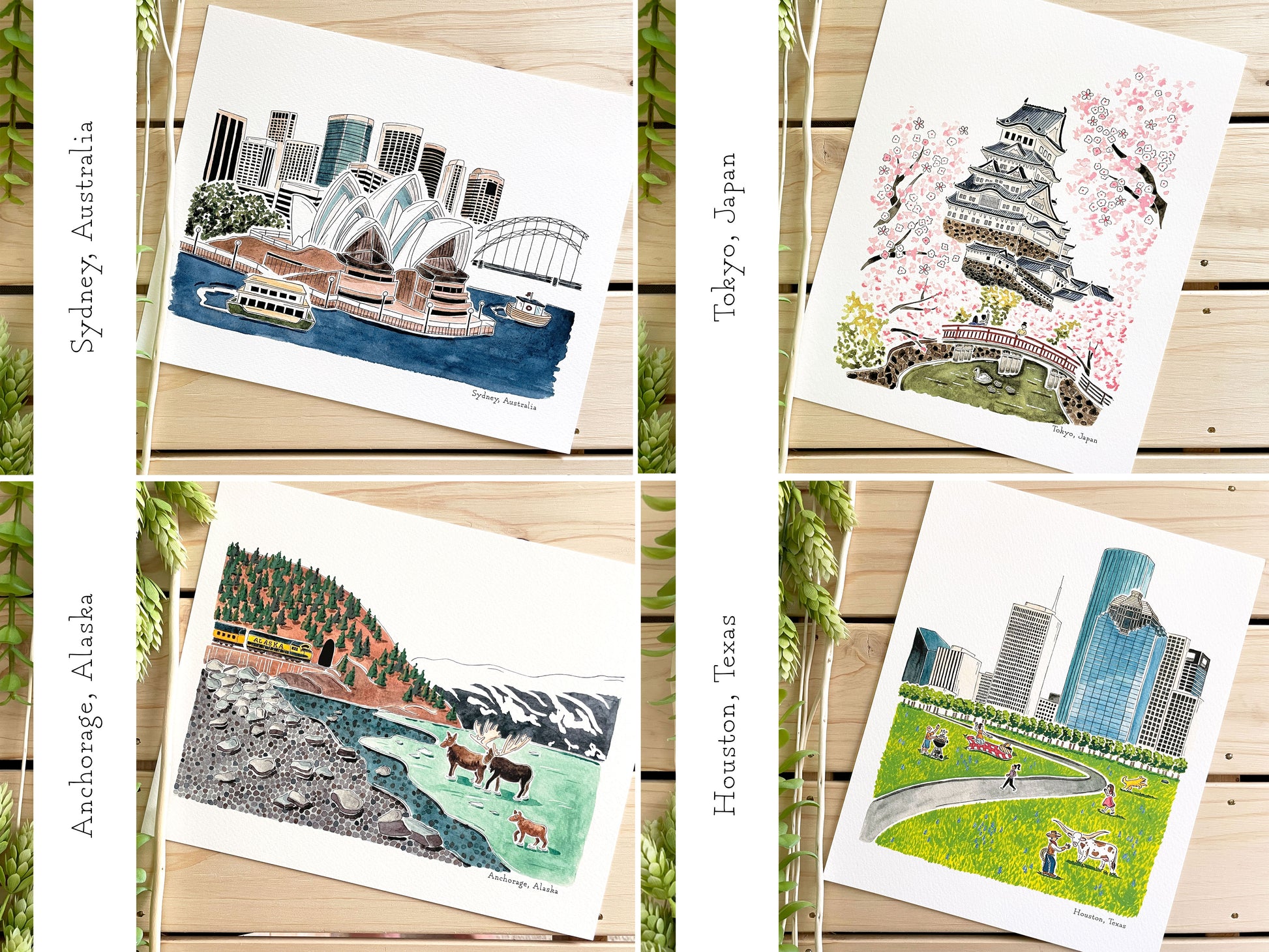 Travel to your favorite cities with this set of watercolor art prints! Pick the cities you would like in your set and whether you would like the city names printed on them!