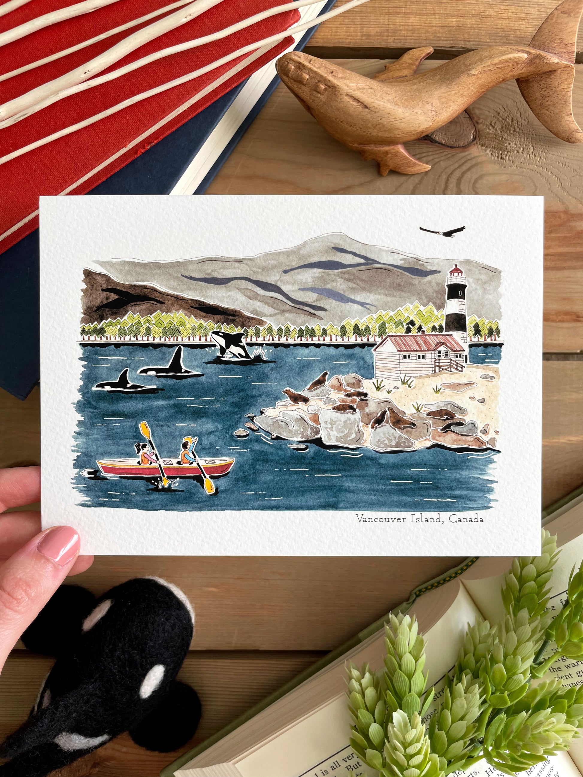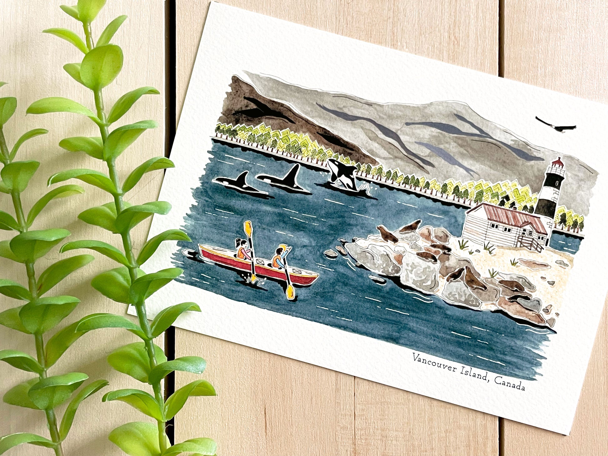 Travel to Vancouver Island, Canada with this watercolor art print! Kayak with the orcas and soar with the eagles of Vancouver Island in this adorable painted scene.