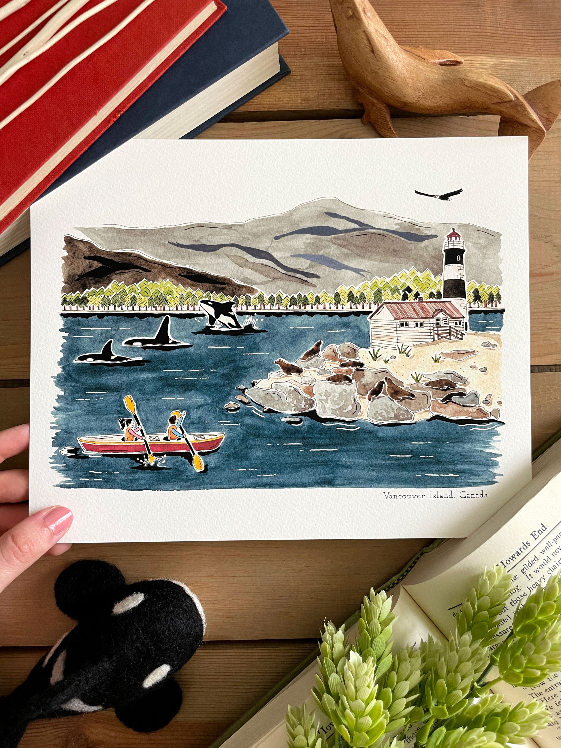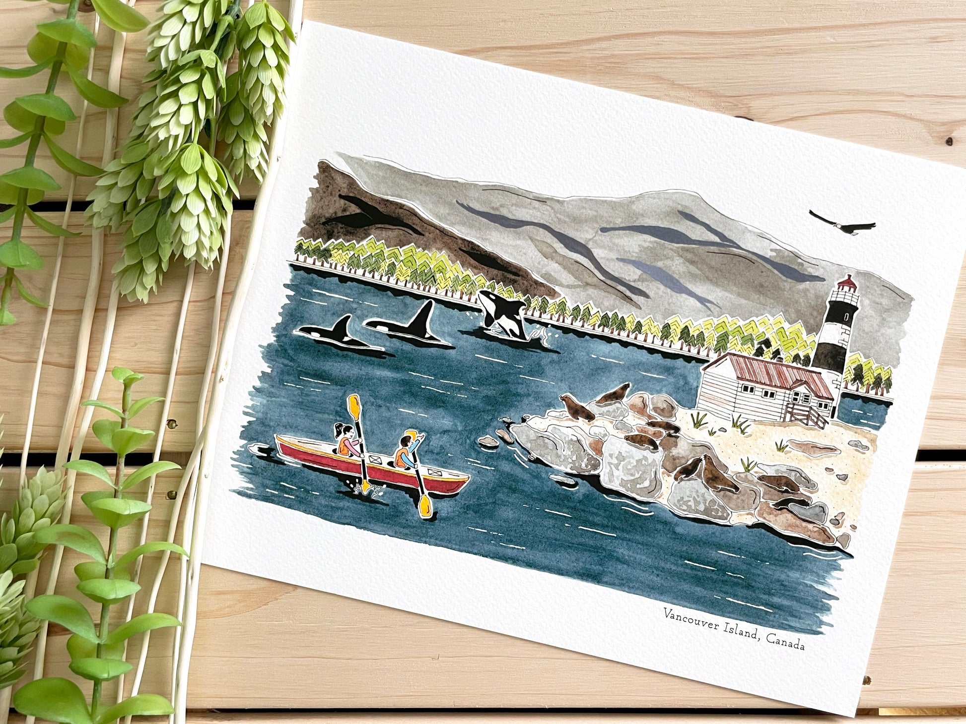Travel to Vancouver Island, Canada with this watercolor art print! Kayak with the orcas and soar with the eagles of Vancouver Island in this adorable painted scene.